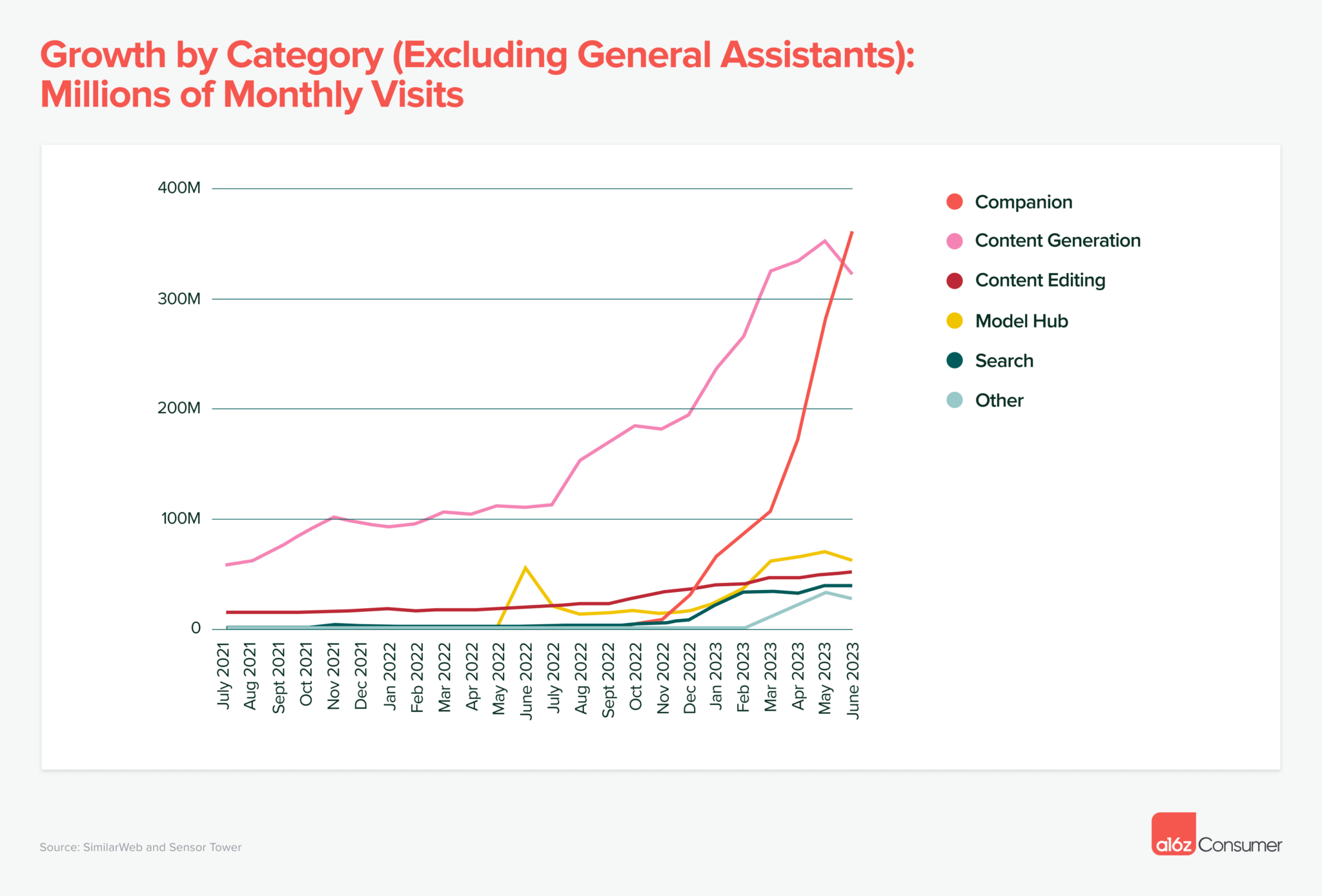 然而,最近几个月已经出现了另外两个明显推动使用量的类别,分别是 AI 伴侣(如 Character.AI)和内容生成工具(如 Midjourney、ElevenLabs)。