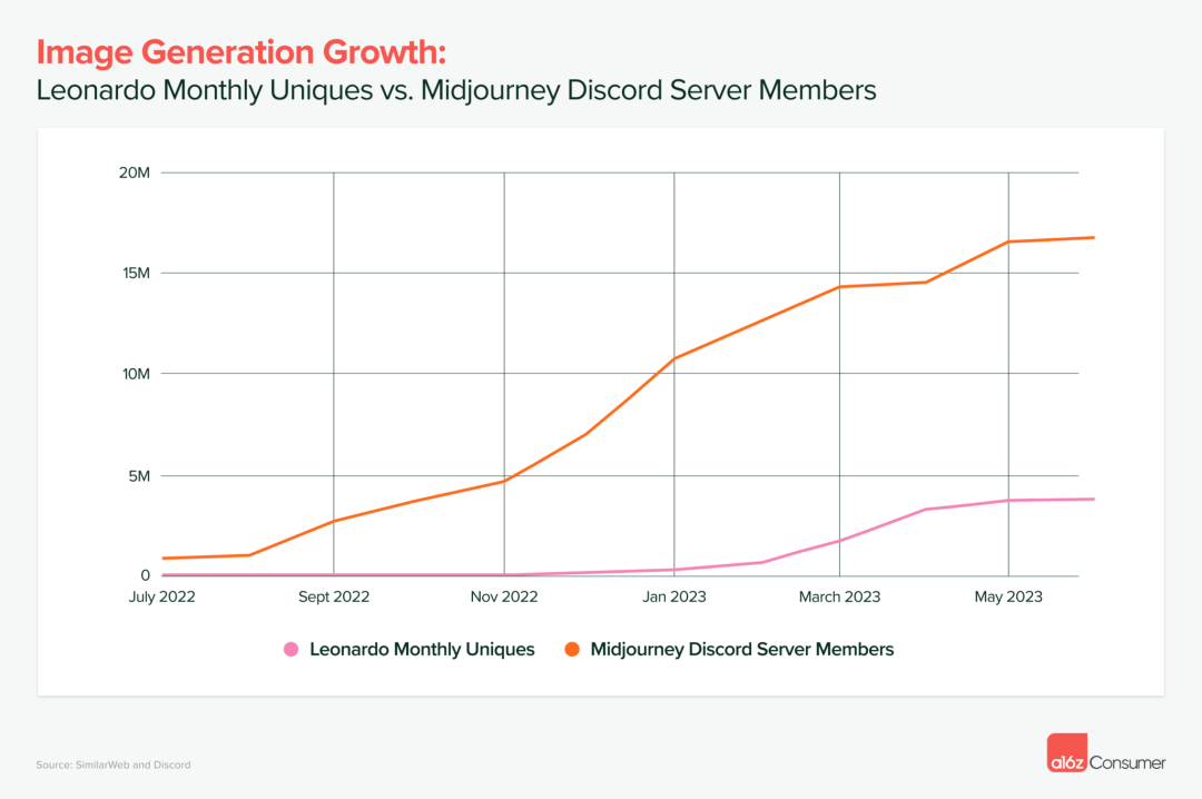 下图展示了 Midjourney 的 Discord 服务器成员与 Leonardo 月独立访问数的增长对比。虽然规模仍不可相提并论,但在 Midjourney 用户持续上升的同时,Leonardo 也已经成功地吸引了数百万用户。