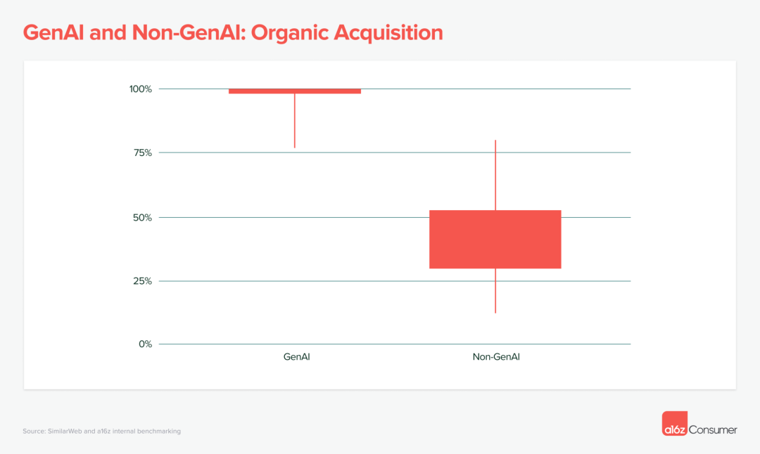 这些 GenAI 产品的最低四分位数中,只有 2% 的流量来自付费渠道。相比之下,根据 a16z 对 150 种产品的基准测试,非 AI 类消费者订阅产品的最低四分位数中,有 70% 的流量需要付费。