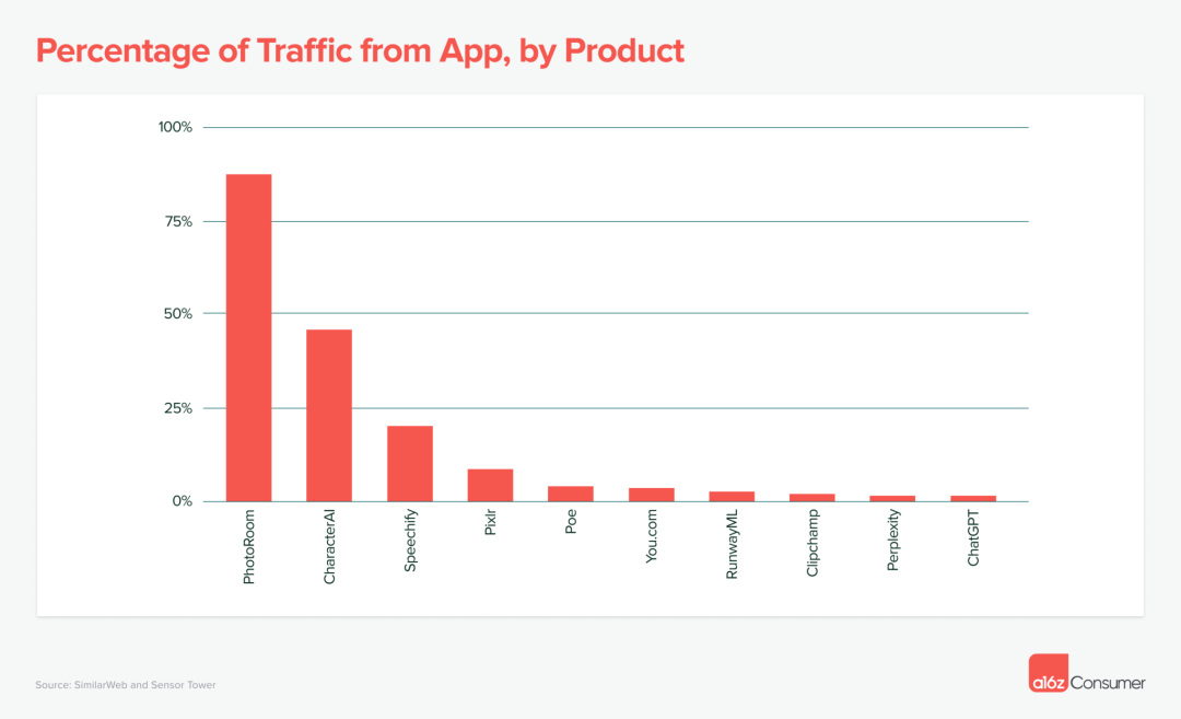 有 3 个例外:专业设计工作室 PhotoRoom(估计移动端应用流量占比为 88%)、伴侣应用 Character.AI(移动端应用流量占比 46%)和文生语音产品 Speechify(移动端应用流量占比 20%)。