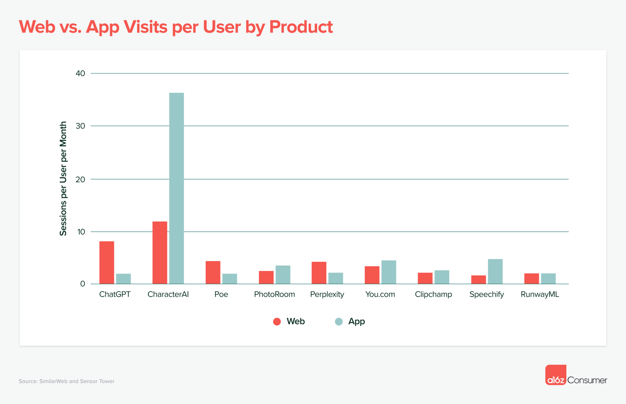 考虑到现在用户平均每天在移动设备上花费的时间比桌面多 36 分钟(4.1 小时 vs. 3.5 小时),我们预计随着技术的成熟,会有更多移动为先的 GenAI 产品出现。