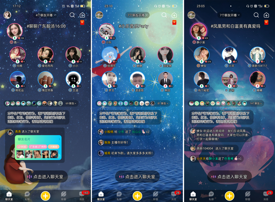 【聊天室】是天聊的核心功能,打开 App 映入眼帘的便是正在热聊中的聊天室,进入聊天室即可参与其中,并通过上下滑动选择加入自己感兴趣的那一间。