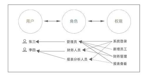 以角色为中介,首先创建访问每个部门和员工的访问权限,然后创建不同的角色,根据这些角色的职责不同分配不同的权限,建立角色-权限关系后,不同的角色将会有不同的权限。
