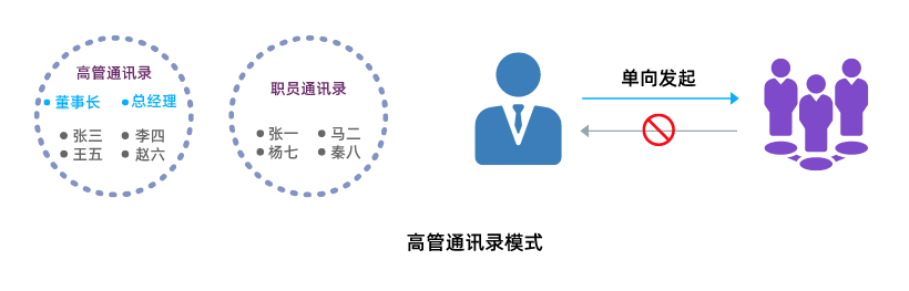 (2)支持设置通讯录显示高管名单,支持高管之间聊天,以及高管主动找普通员工聊天。